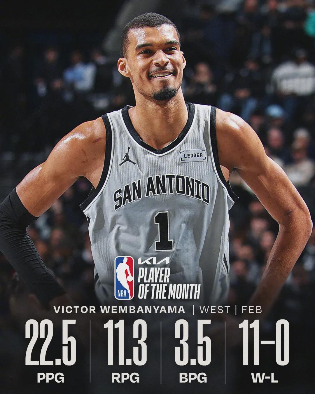 刚刚过去的2月份,马刺11胜0负,联盟最佳战绩,文班亚马场均22.5分11.3篮板3.5盖帽。全明星之后文班一共送出26记盖帽,篮网全队只有24记盖帽,雄鹿全队23记盖帽。哈珀在2月份场均12.5分3.9篮板4.9助攻,投篮命中率55.4%。