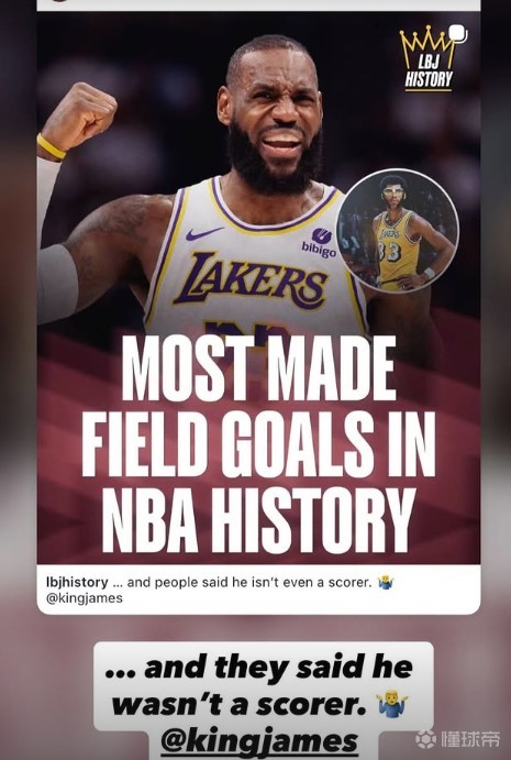 北京时间3月6日,湖人球星勒布朗-詹姆斯达成NBA历史进球榜第一的里程碑,赛后他转发了自己进球榜第一的海报,并配文:他们说他不是一个得分手。