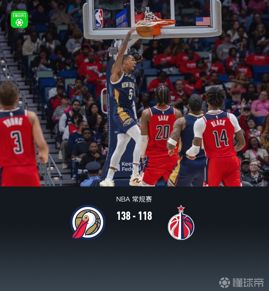 第四节鹈鹕萨迪克-贝拿下8分,奇才威尔-莱利拿下7分,最终鹈鹕138-118战胜奇才