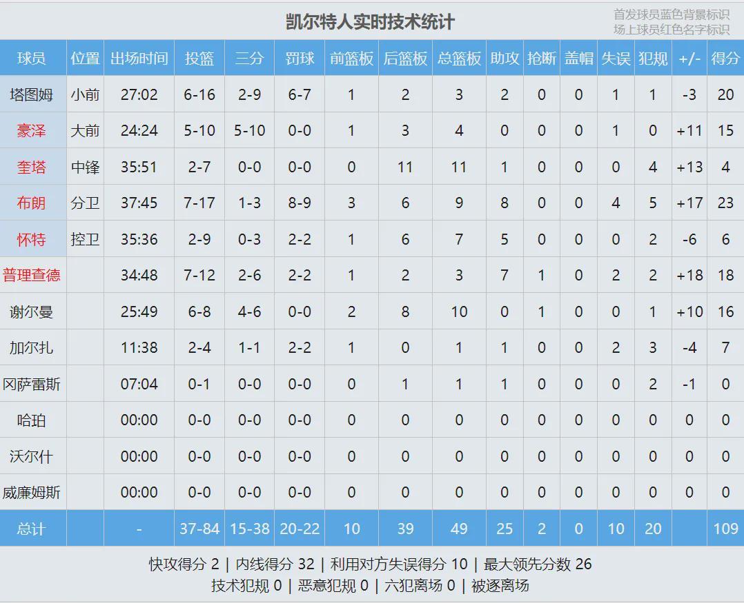 先说说第一场对决,凯尔特人几乎全场压制骑士,最多领先到26分。四节比分(凯尔特人在前):35-26、21-10、30-33、23-29。这是塔图姆复出后的第二场比赛,首节独得12分,全场出战27分钟,16中6拿到20分3篮板2助攻。