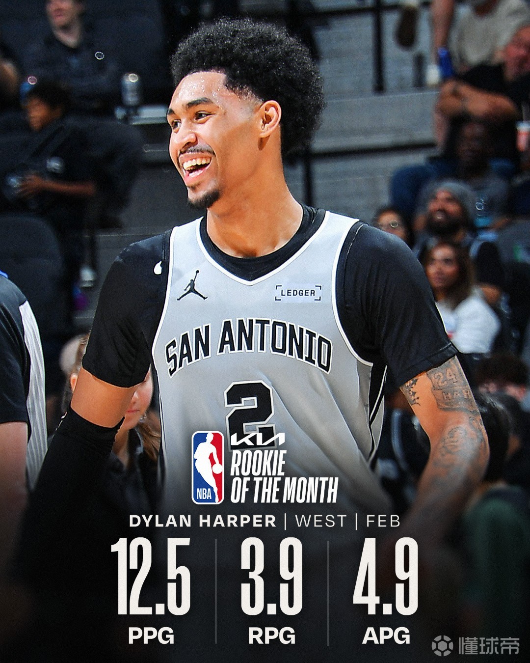 马刺在2月则取得了11战全胜的完美战绩,其中迪伦-哈珀场均贡献12.5分3.9篮板4.9助攻,最终他也被评为了NBA2月西部最佳新秀。