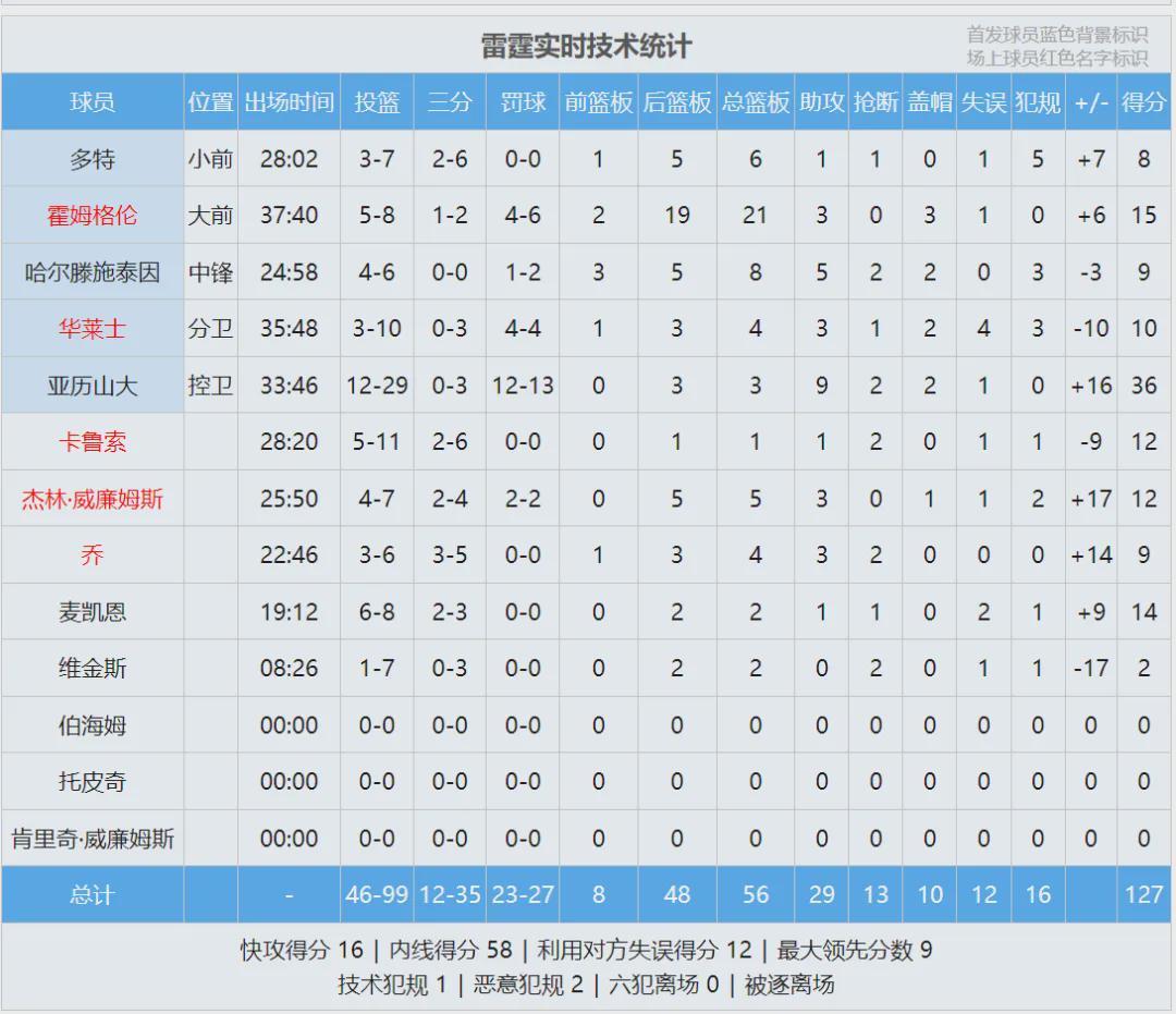 亚历山大加时赛没打,雷霆防守反击连连得手。最后半分钟,雷霆121-112领先到9分,穆雷连中3记三分。雷霆没有犯错,掘金无力回天。全场结束,雷霆127-121击败掘金。亚历山大36分3板9助2断2帽、霍姆格伦15分21板3帽。
