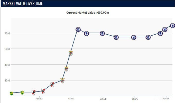 在2023年冬窗以1.2亿欧元的转会费加盟切尔西后,恩佐的身价从5500万欧大涨至8500万欧,不过由于当赛季切尔西表现不佳加上他自己的适应问题,23年6月,他的身价下跌至8000万欧。