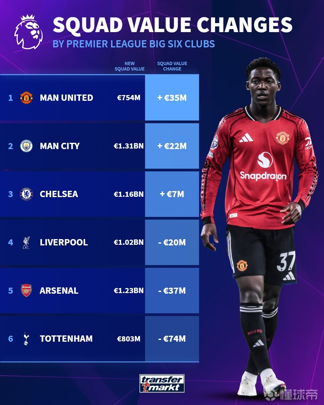 3月9日,德国转会市场网站更新了英超球员身价,并列出了英超BIG6球队身价变化,曼联上涨3500万欧最多,而热刺则暴跌7400万欧。