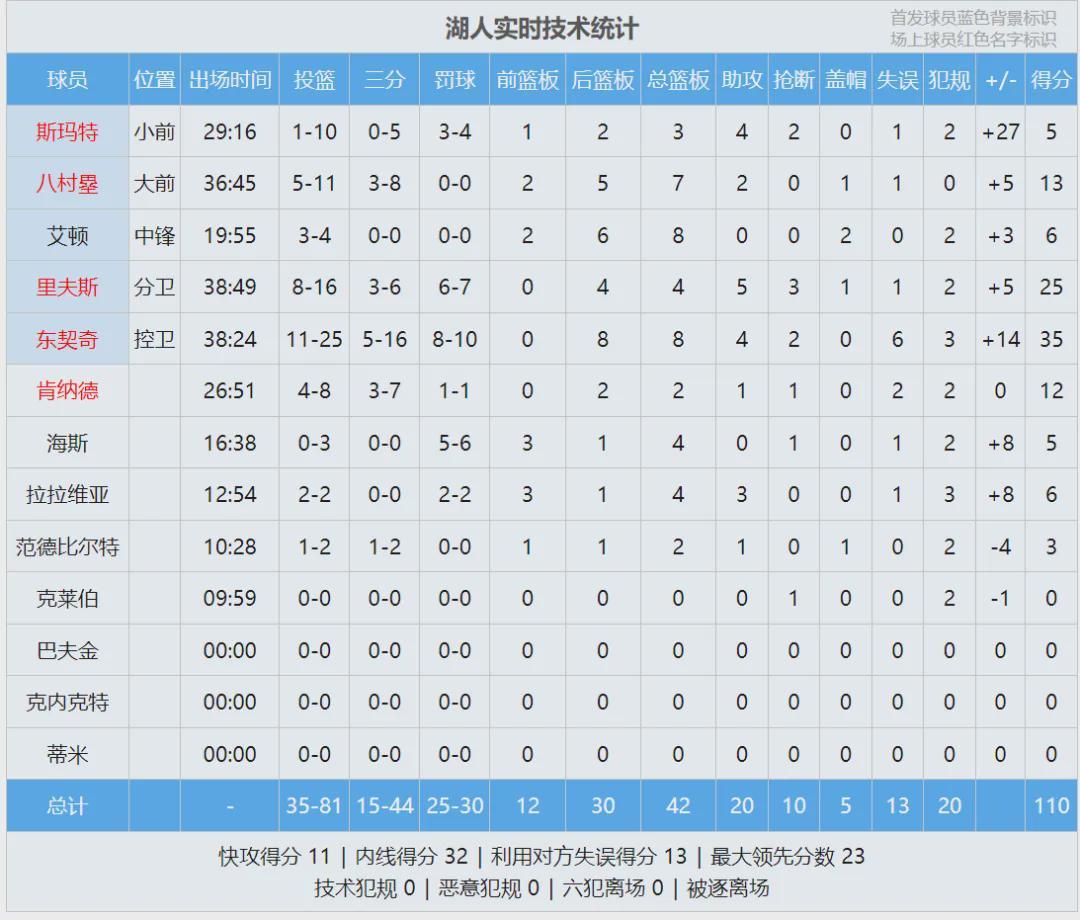 湖人反超掘金,排名升至西部第五位。最后看看湖人和尼克斯的比赛数据,说说你的感受: