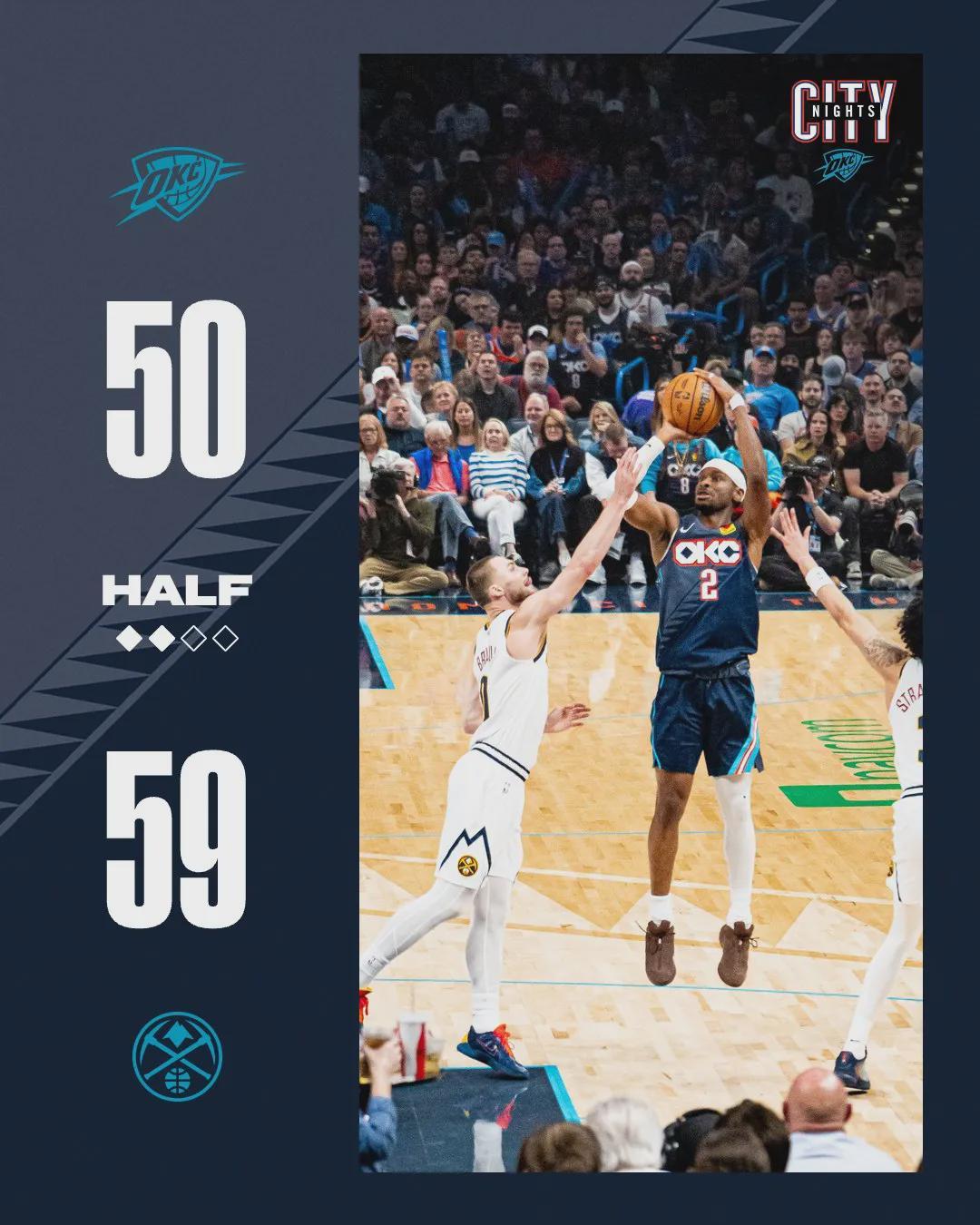亚历山大第二节6中4独得10分2盖帽,但雷霆全队上半场三分只有15中4。小哈达威成为掘金奇兵,上半场三分4中4独得12分,一个人的三分命中数和雷霆全队持平。但穆雷迷失了,上半场投篮8中2拿到8分,雷霆单节31-26追回5分。