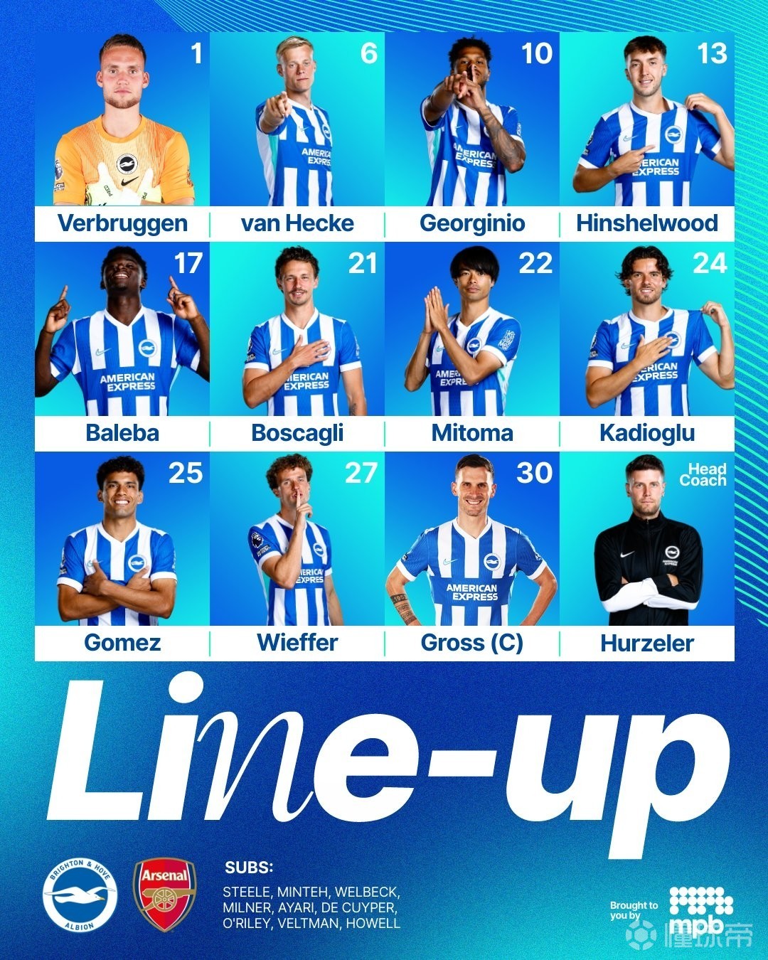布莱顿首发:1-费布鲁亨、27-魏费尔、6-范黑克、21-博斯卡利、24-卡迪奥卢、13-欣谢尔伍德、17-巴莱巴、30-格罗斯、25-迭戈-戈麦斯、10-吕特、22-三笘薫